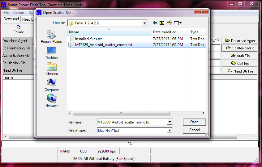 4. Open scatter_loading and select SW---> Software-> Primo_H2_V4.3_2013-05-29 MT6589_Android_scatter_emmc.txt